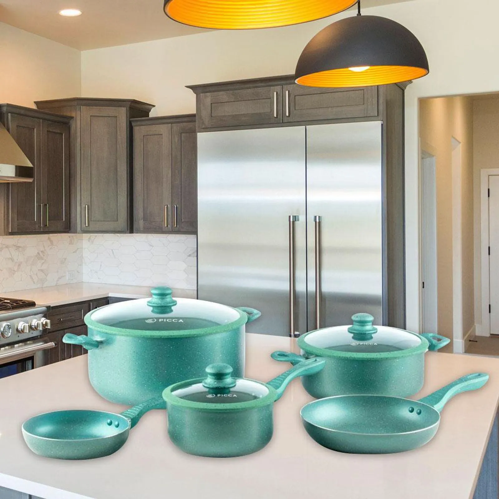 Si buscas durabilidad, practicidad y buena relación precio–valor, la Batería de cocina de 8 piezas de mármol turquesa marca Picca equilibra antiadherencia, calor uniforme y comodidad para preparar más en menos tiempo. Con la Batería de cocina de 8 piezas de mármol turquesa marca Picca, optimizas tus preparaciones y mantienes tu espacio ordenado con un set versátil para cada comida.