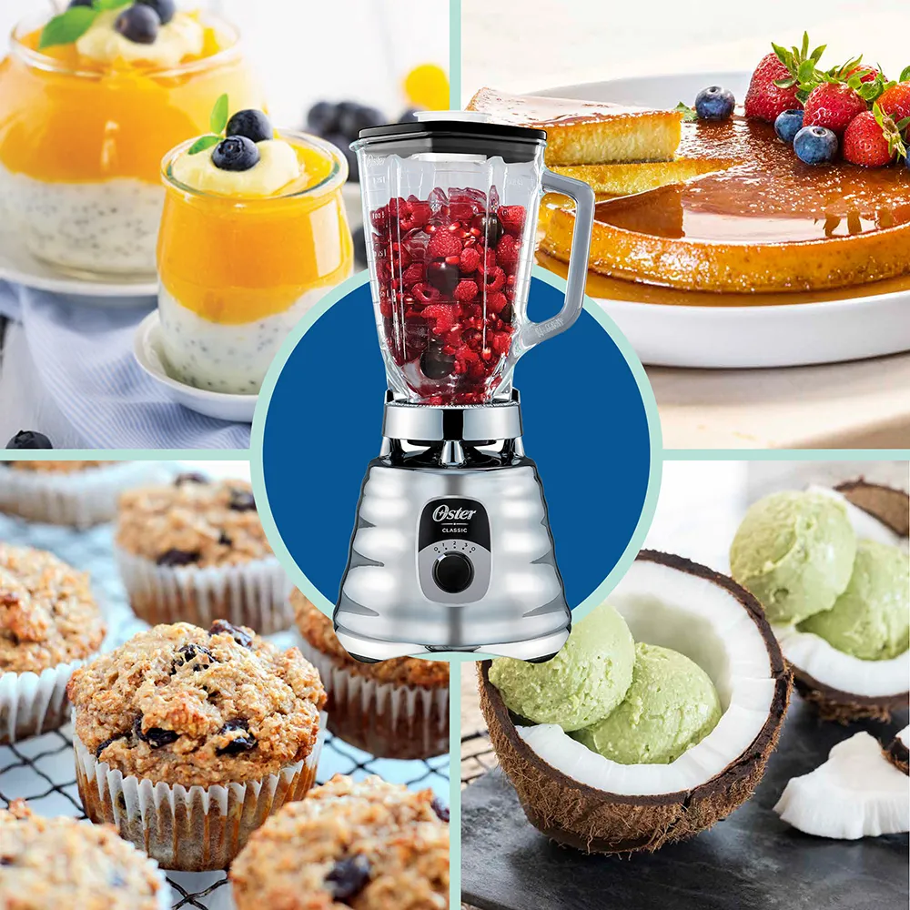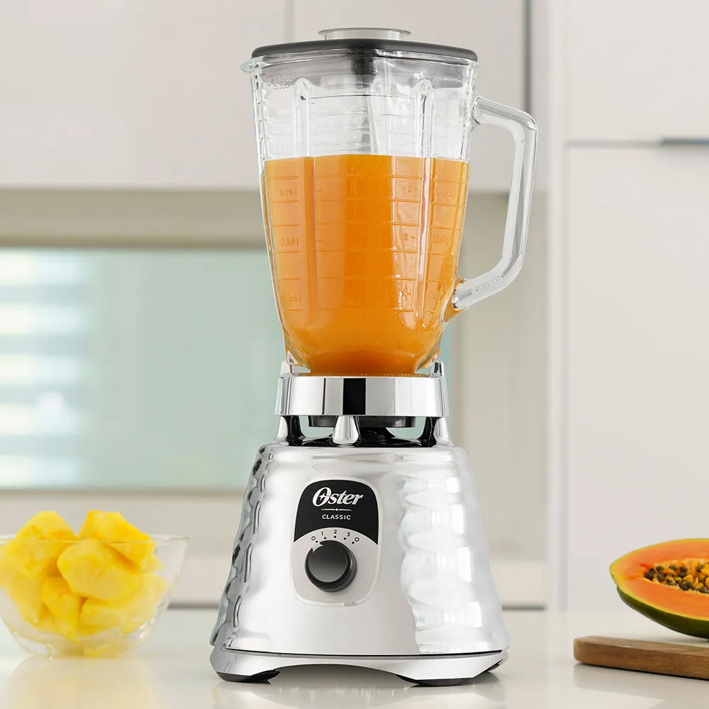 La Licuadora Oster Clásica Cromada BLST4655 conserva el diseño icónico con mejoras reales de desempeño para uso diario. Incorpora vaso de vidrio Boroclass® 1.25 L (5 tazas), acople metálico All-Metal Drive (10× más fuerte), motor 6× más durable y perilla ergonómica de 3 velocidades para controlar texturas con precisión. En el sitio oficial de Oster LATAM esta línea se lista con potencia hasta 1000 W y cuchilla trituradora de hielo, ideal para batidos, salsas y hielo picado.